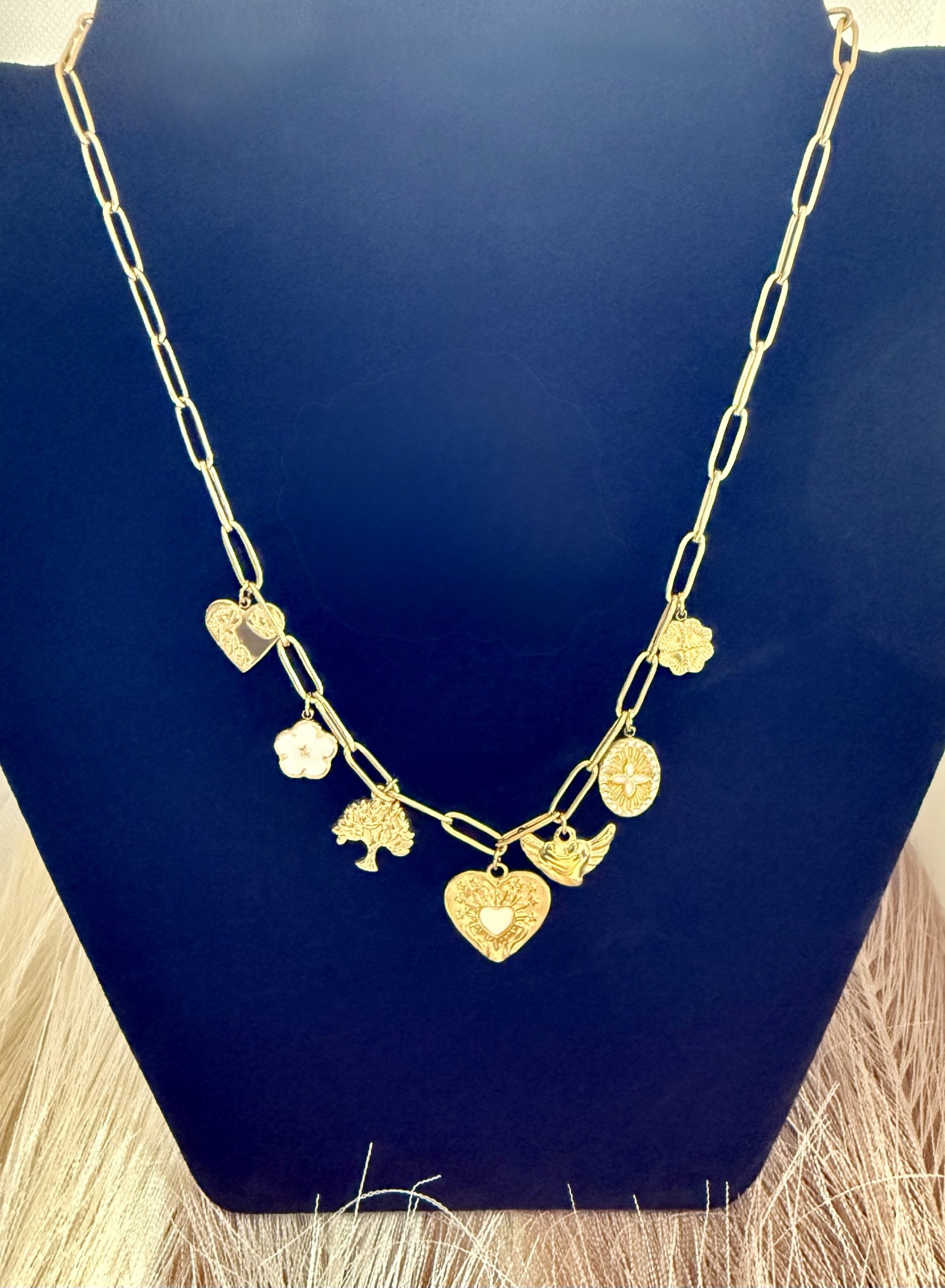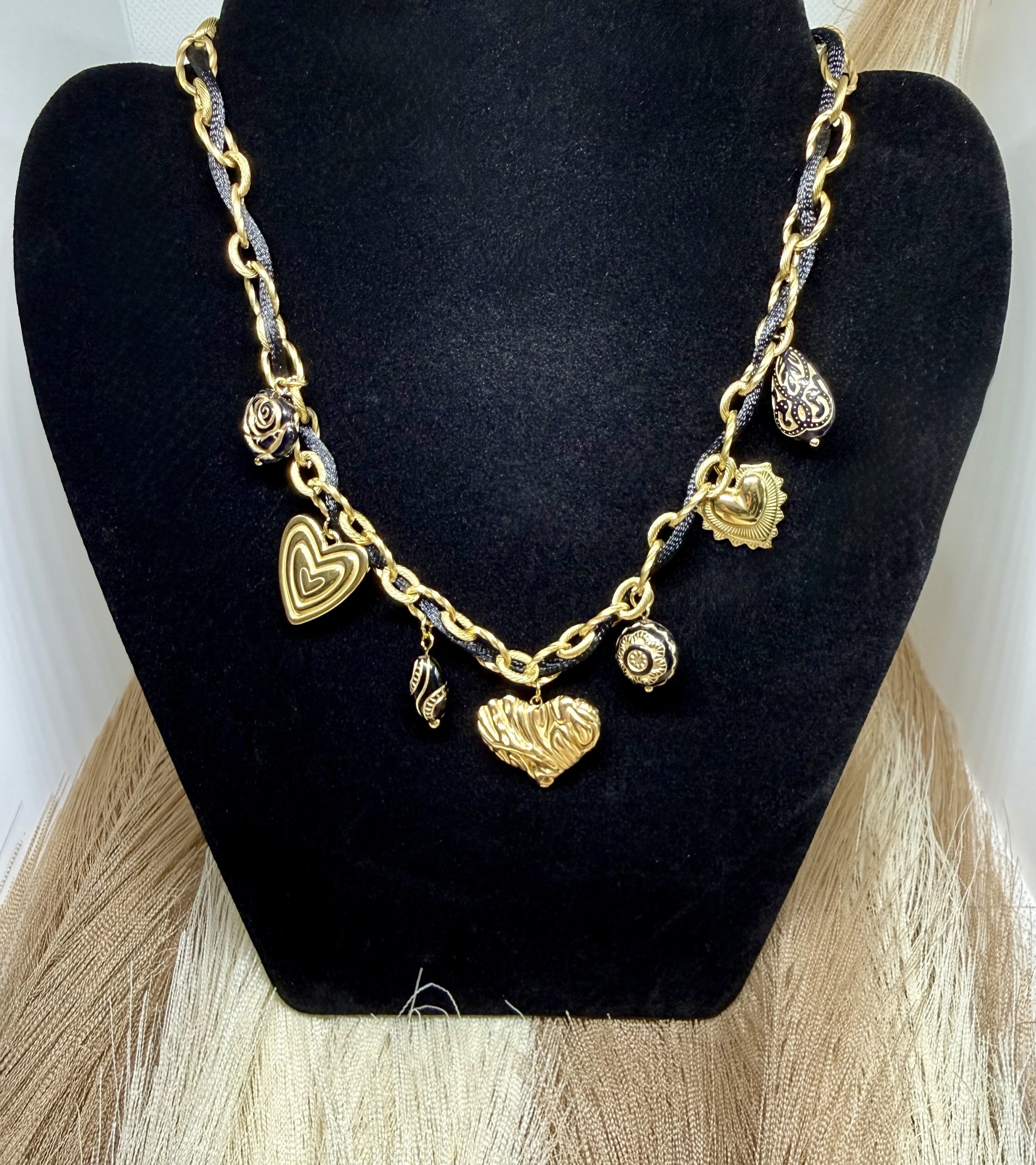 Ses maillons dorés entrelacés d’un cordon noir s’ornent de pendentifs symboliques : cœurs, rose, médaillons ciselés… chaque détail raconte une histoire unique.